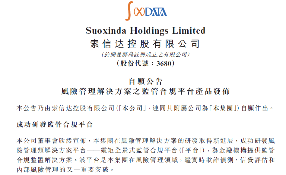 2月25日下午,索信達控股有限公司(下稱:索信達)發布公告稱,在風險管理解決研發方面取得新進展,成功研發風險管理類平臺——靈矩全景式監管合規平臺,為金融機構提供監管合規整體解決方案。公告稱,該平臺是公司在風險管理領域的又一突破。