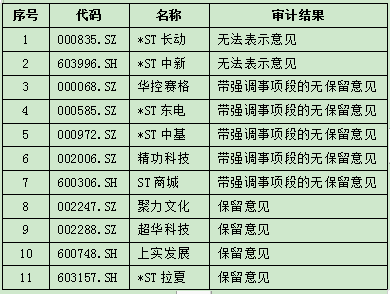 同花順數(shù)據(jù)顯示,截至4月10日,兩市有11家公司財報被出具了非標意見,包括無法表示意見、帶強調(diào)事項段的無保留意見和保留意見。查閱這11家公司的財報狀況可知,因訴訟引起的財務(wù)爭議、無法獲得部分審計材料、持續(xù)經(jīng)營能力存疑是構(gòu)成這些公司年報被非標的主要原因。