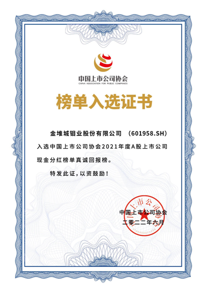 近日,中國上市公司協會發布了A股上市公司現金分紅榜單,該榜單包括“上市公司豐厚回報榜單”和“上市公司真誠回報榜單”各200家。其中,金鉬股份上榜上市公司真誠回報榜單。