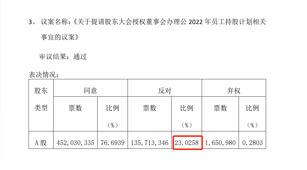 7月20日,恒生電子股份有限公司(簡(jiǎn)稱:恒生電子)發(fā)布了2022年第二次臨時(shí)股東大會(huì)決議公告,公司以76.69%的同意率,通過(guò)了關(guān)于公司2022年員工持股計(jì)劃的議案,其中,反對(duì)票占比高達(dá)23.03%,其余約0.28%為棄權(quán)票。