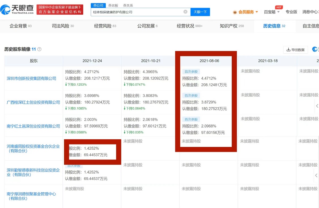 根據天眼查APP顯示,深圳市創新投資集團有限公司、廣西桂深紅土創業投資有限公司、南寧紅土邕深創業投資有限公司首次參股時間為2021年8月6日,河南盛周股權投資基金合伙企業(有限合伙)首次參股時間為2021年12月24號。本次交易后上述公司將不再持有恒保健康股權。
