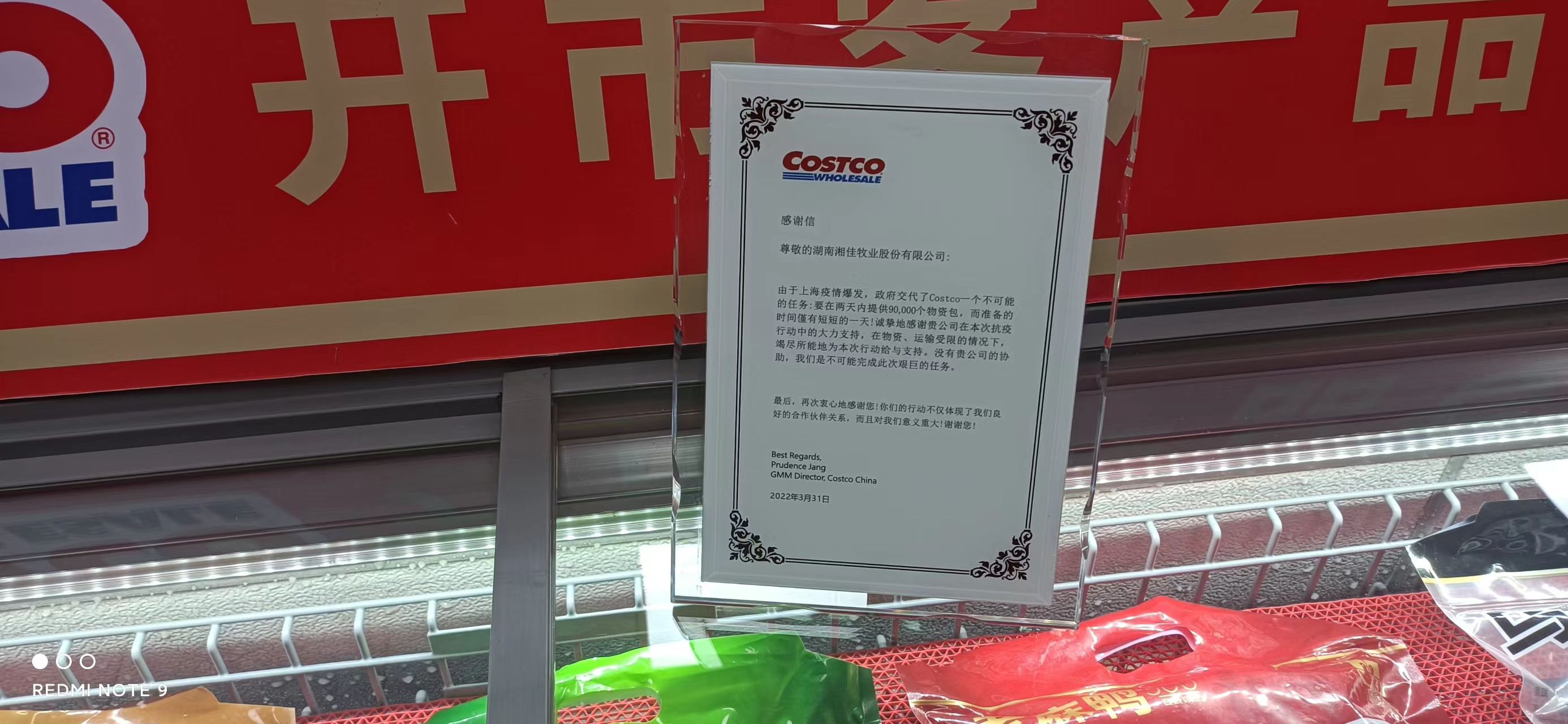 常德缽子菜是湘菜中的經典菜肴,其中石門土雞•烤雞、石門肥腸、茶油蒸雞、洞庭谷鴨、石門土雞雞公煲、醬香黑豬蹄、湘西黑豬肉、石門土家臘肉等為石門名品,有滋味厚重、冬春進補等特點,也是湘佳股份較早實現的預制菜產品。在產品陳列室里,記者看到眾多的產品琳瑯滿目,而在2022年3月上海防疫中,由美國最大的連鎖會員制倉儲量販店COSTCO發來的感謝信則立在柜臺的一角。