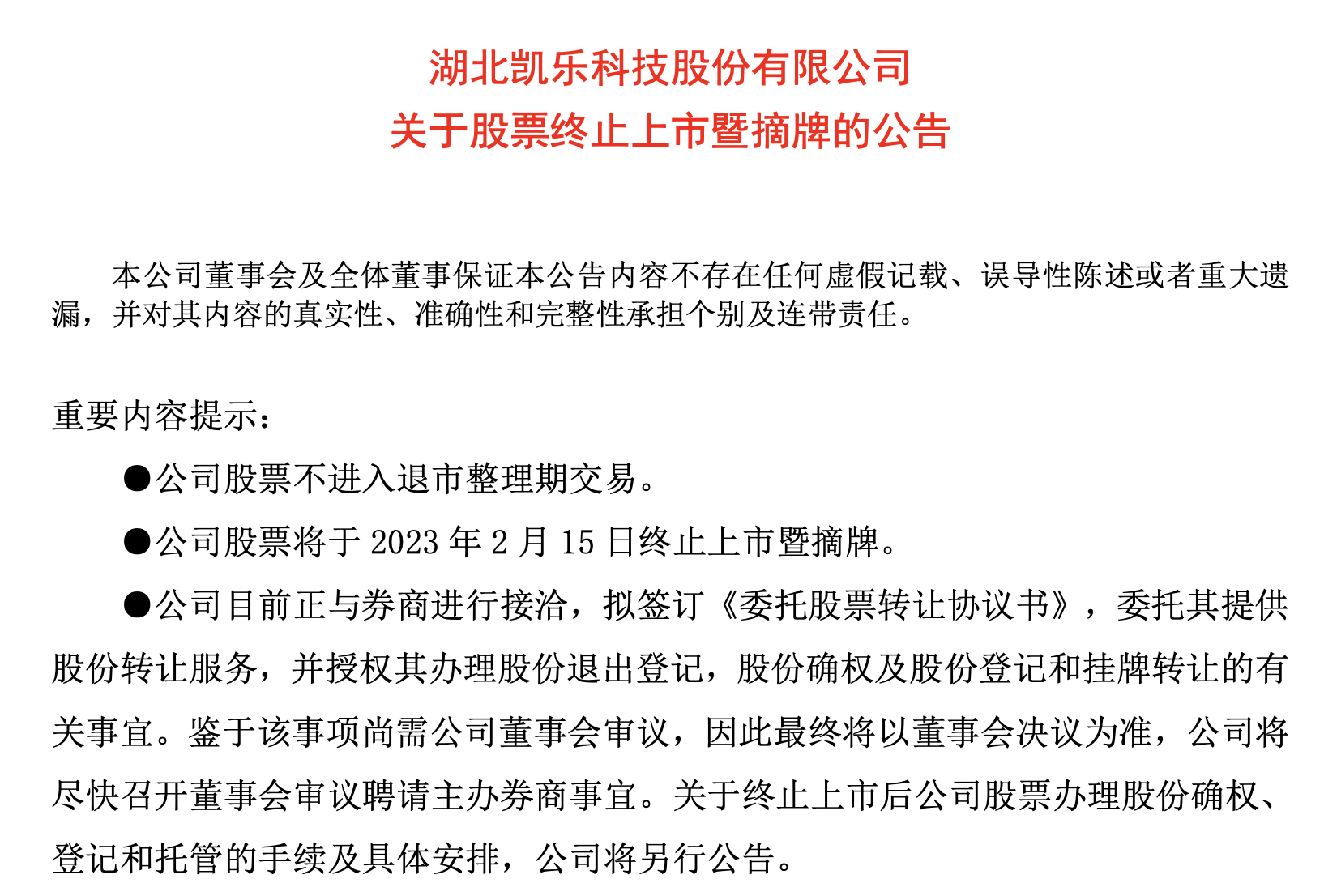 2月8日,*ST凱樂公告稱,當日收到上交所《關于湖北凱樂科技股份有限公司股票終止上市的決定》,因觸及交易類退市指標,上交所決定終止公司股票上市,公司股票將于2月15日終止上市暨摘牌。