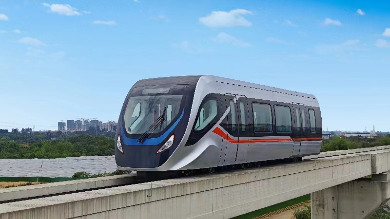 在試驗線上行駛中的國產(chǎn)化內(nèi)嵌式中低速磁懸浮車輛/公司供圖