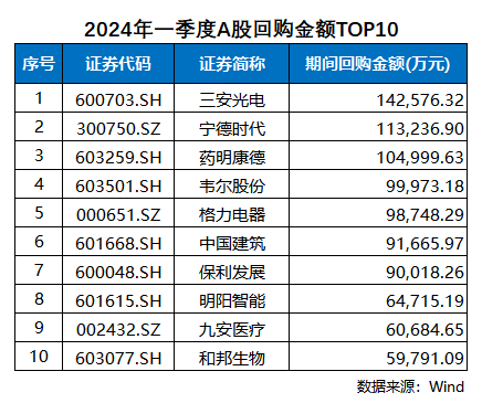 2024年以來,A股支持回購力度持續加大,回購金額創新高。Wind數據顯示,2024年第一季度有1275家A股上市公司已經實施了回購,已回購金額總計約578億元。其中,第一季度已回購金額超過10億元的上市公司有3家,藥明康德以約10.5億元回購規模位列醫藥板塊第一。