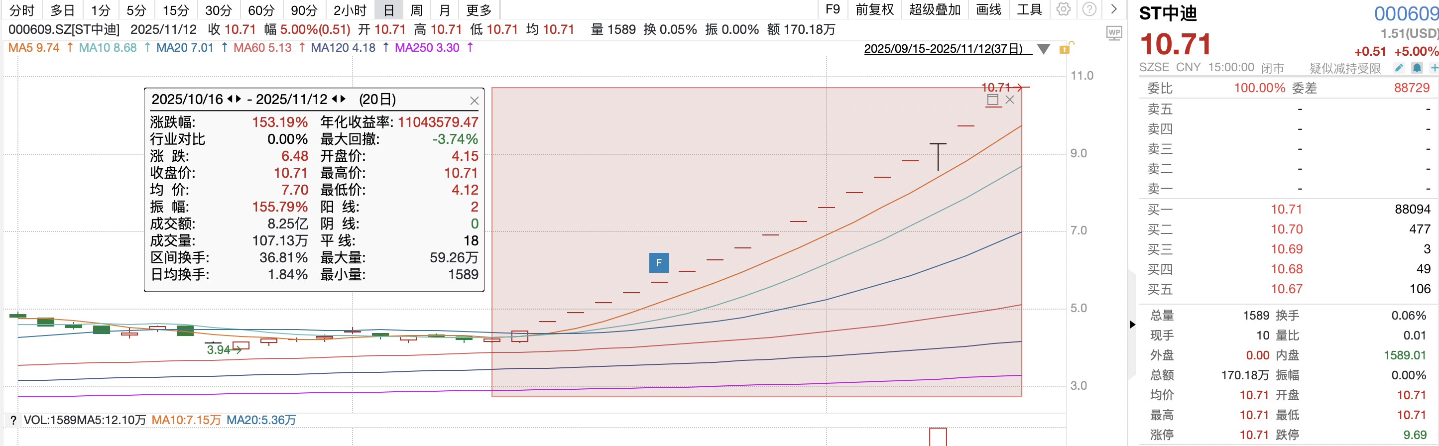 Wind數(shù)據(jù)顯示,ST中迪股價自10月16日至11月12日期間,累計漲幅高達(dá)153.19%,其間更是出現(xiàn)七次股價異常波動。這種劇烈的股價波動與公司基本面形成鮮明對比。截至11月11日,ST中迪靜態(tài)市盈率為-12.83倍,滾動市盈率為-15.88倍,市凈率為-376.33倍,而同期中國上市公司協(xié)會行業(yè)分類房地產(chǎn)業(yè)的靜態(tài)市盈率為28.62倍,滾動市盈率為26.19倍,市凈率為0.93倍。公司各項估值指標(biāo)與行業(yè)平均水平存在嚴(yán)重偏離,顯示出股價波動嚴(yán)重背離公司基本面。