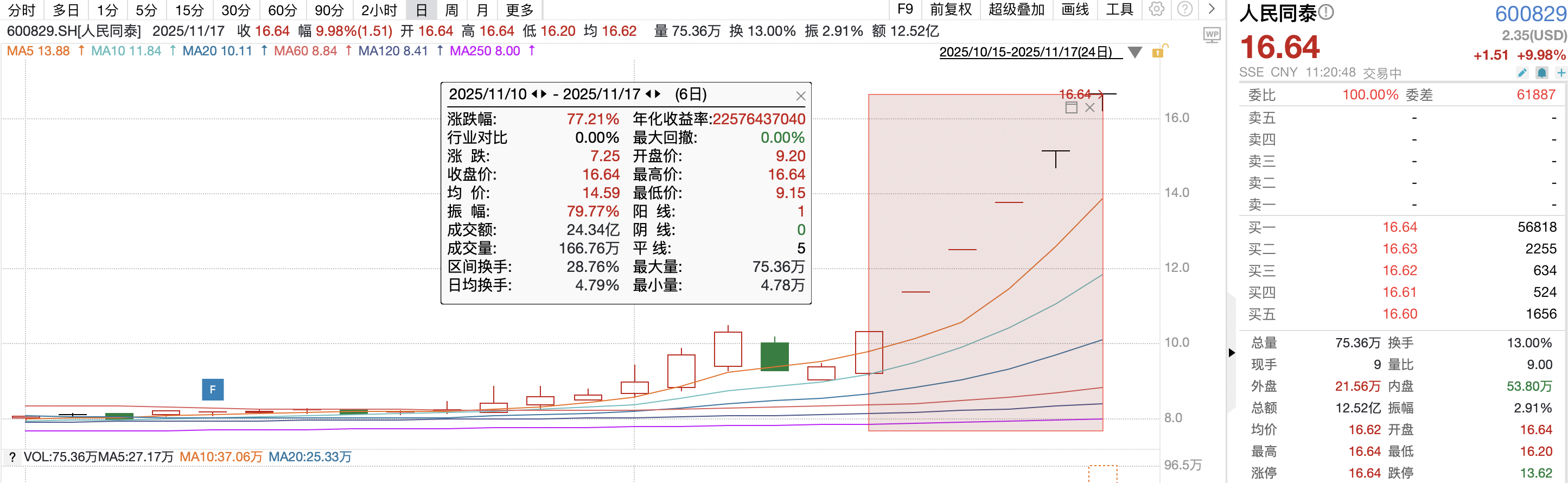 Wind數據顯示,截至11月17日午間收盤,人民同泰已連續6個交易日漲停,公司股價從11月10日的9.20元/股一路飆升至11月17日的16.64元/股,累計漲幅高達77.21%,總市值達到96億元。