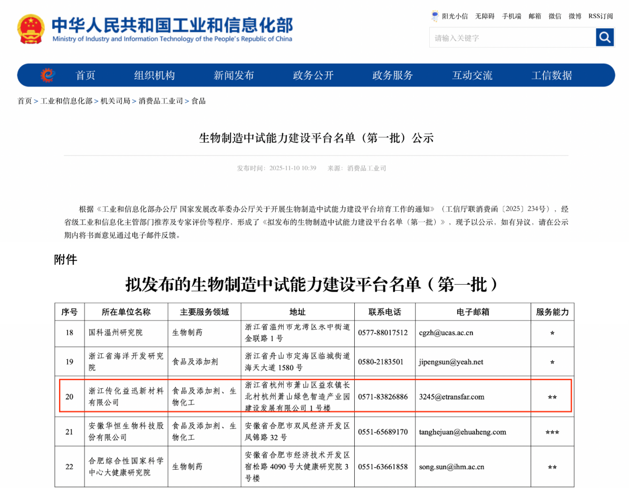 本報訊 (記者馮思婕)近日,工業和信息化部、國家發展改革委聯合公示全國首批生物制造中試能力建設平臺名單,全國共有43家單位入選。由傳化集團有限公司(以下簡稱“傳化集團”)與國有資本合作建設運營的“杭州合成生物產業中試(驗證)中心”成功入選,成為浙江省代表性平臺之一。這標志著傳化集團在合成生物產業領域的技術實力與產業化能力獲得國家級權威認可。
