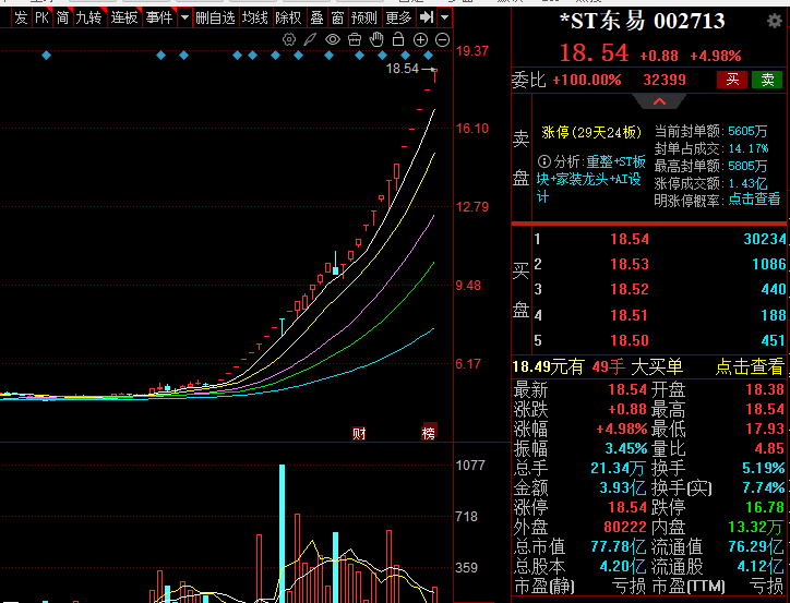 經(jīng)過三個交易日停牌核查后,11月19日,東易日盛家居裝飾集團股份有限公司(證券簡稱:*ST東易,證券代碼:002713)復牌后再度漲停,創(chuàng)下29個交易日內24次漲停紀錄。截至午間收盤,公司股價從9月26日收盤價的5.17元/股漲至18.54元/股,漲幅達258.61%。