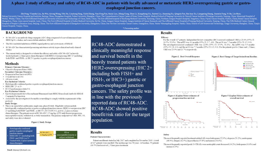 本次多中心臨床研究共入組127例既往接受過2線或2線以上系統化療的HER2過表達(包括IHC3+、IHC2+/FISH+、及IHC2+/FISH-病人)晚期胃癌(包括胃食管結合部腺癌)患者,以獨立療效評價委員會(IRC)評效的主要療效指標客觀緩解率(ORR)為23.6%,中位無進展生存期(PFS)為4.1個月,中位總生存期(OS)為7.5個月。