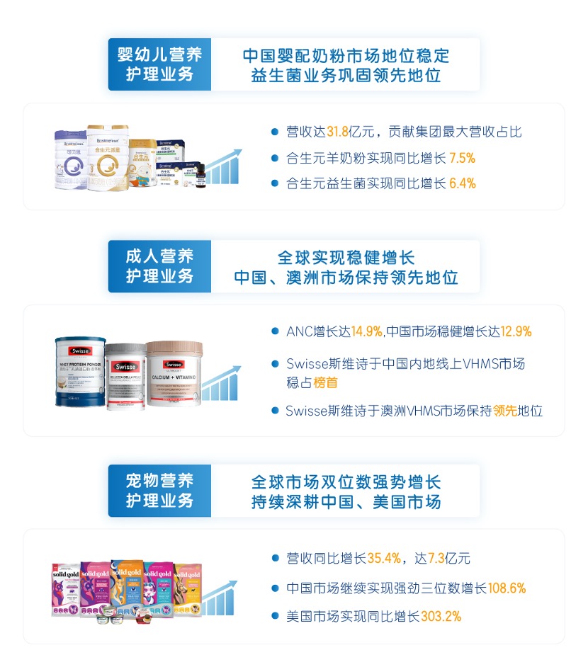 健合集團致力于全家庭營養健康。其中,嬰幼兒營養與護理用品業務(BNC)在中國嬰幼兒配方奶粉市場維持穩定地位,益生菌業務實現6.4%增長,羊奶實現7.5%增長;成人營養與護理用品業務(ANC)同比實現14.9%穩健增長,中國市場保持線上領先地位,為主要貢獻者,澳新市場實現穩健增長;寵物營養與護理用品業務(PNC)營收7.3億元,同比實現增長35.4%。
