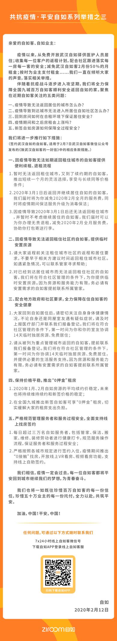此前,自如已陸續發布多項針對疫情的應對舉措,包括2月7日,武漢自如發出《致武漢自如客的一封信》,宣布減免武漢自如客2月50%的租金及2月全月服務費等措施;開放武漢自如驛供醫護人員居住,配合社區防控、協助相關政府部門收集租客返程信息,按時為業主支付租金等。