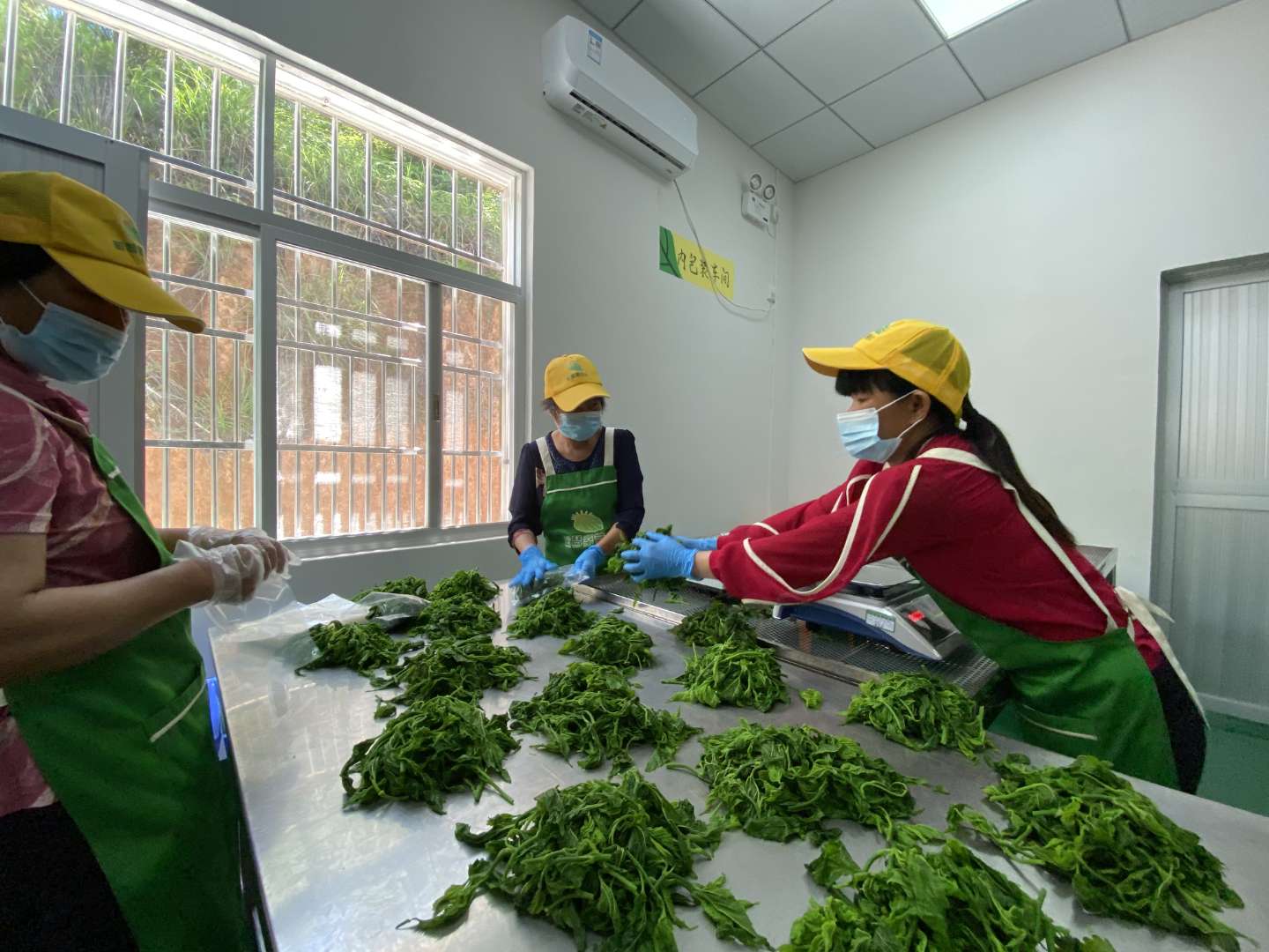 (桑芽菜種植合作社工人們在車間進(jìn)行分揀包裝)