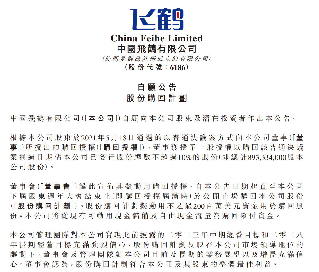 6月9日,中國飛鶴發布股份購回計劃,宣布自公告發布之日起至下屆股東大會結束時止,擬用不超過200百萬美元從公開市場購回股份,擬購股份為893334000股,占公司已發行股份總數的10%以內。該股份購回計劃充分彰顯飛鶴管理層對公司未來發展的信心。