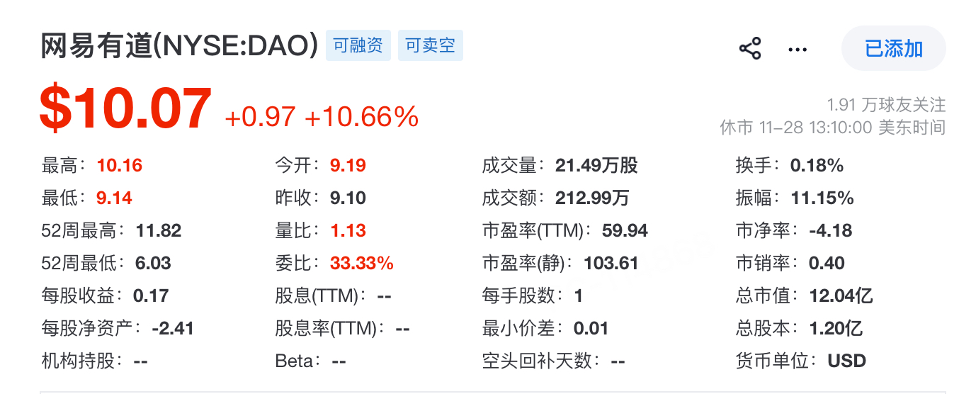 本報(bào)訊 (記者袁傳璽)美東時(shí)間上一個(gè)交易日,網(wǎng)易有道(NYSE:DAO)股價(jià)強(qiáng)勢(shì)拉升,截至收盤大漲10.66%,報(bào)收10.07美元/股,公司總市值12.04億美元。