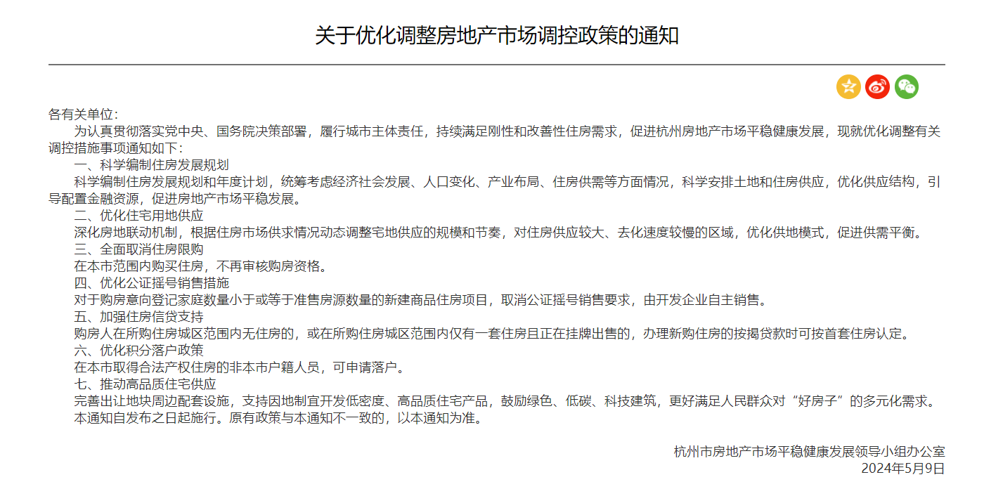 5月9日,杭州市房地產市場平穩健康發展領導小組辦公室發布《關于優化調整房地產市場調控政策的通知》(以下簡稱《通知》)。