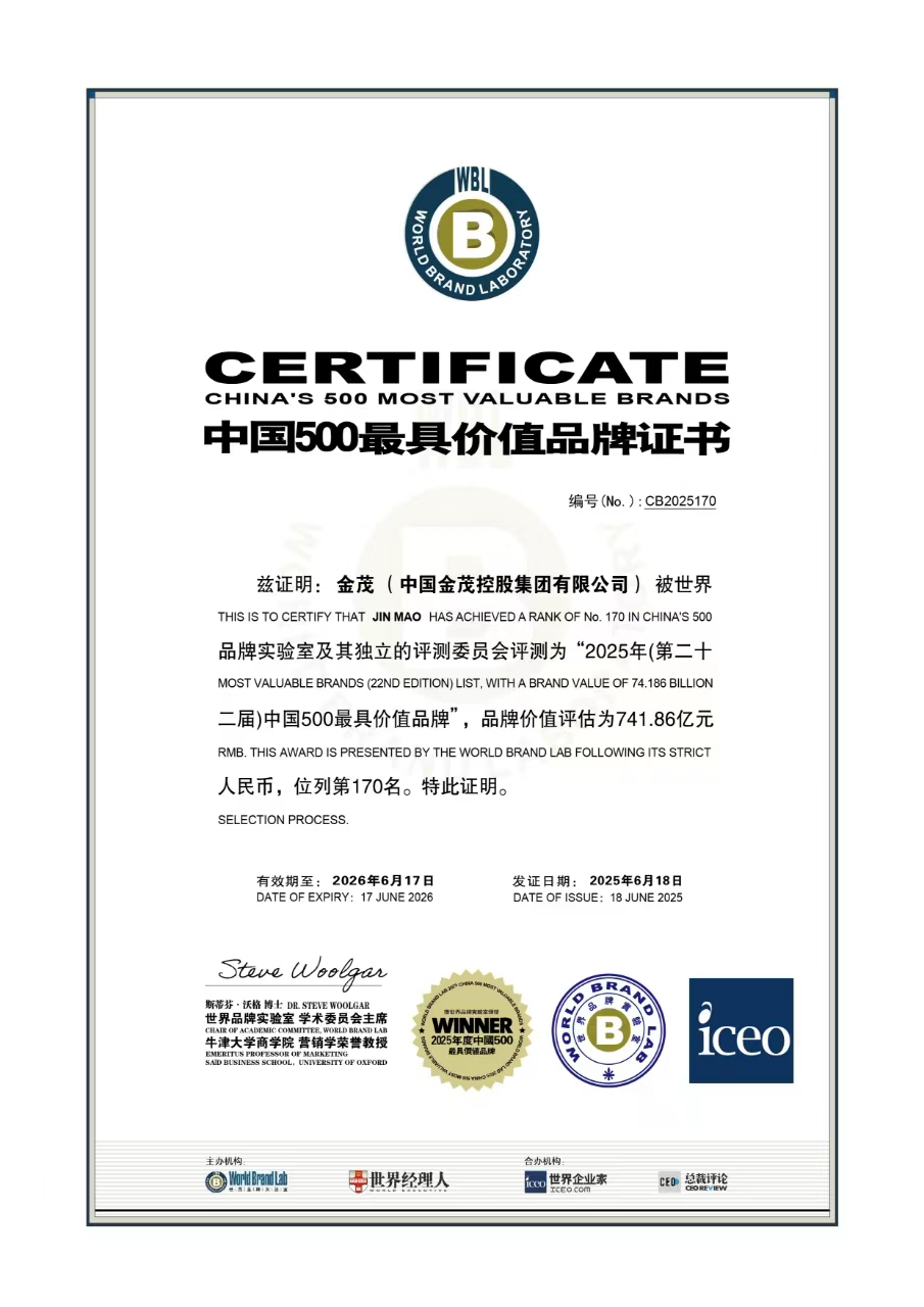 6月18日,世界品牌實驗室發布2025年“中國500最具價值品牌”榜單。“金茂”以741.86億元的品牌價值再次入榜,位列第170位,品牌價值較去年提升近80億元,排名上升一位。據悉,“金茂”已連續21年入選“中國500最具價值品牌”,展現了穩定的品牌號召力及發展韌性。