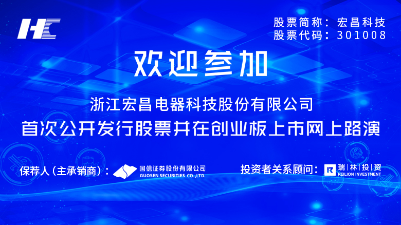 浙江宏昌電器科技股份有限公司首次公開發(fā)行股票并在創(chuàng)業(yè)板上市網(wǎng)上路演將于2021 年 5 月 27 日(周四)14:00-17:00,以網(wǎng)絡(luò)遠(yuǎn)程文字交流的形式在本網(wǎng)舉行。網(wǎng)上提問已經(jīng)開通,歡迎投資者積極參與。[詳細(xì)]
