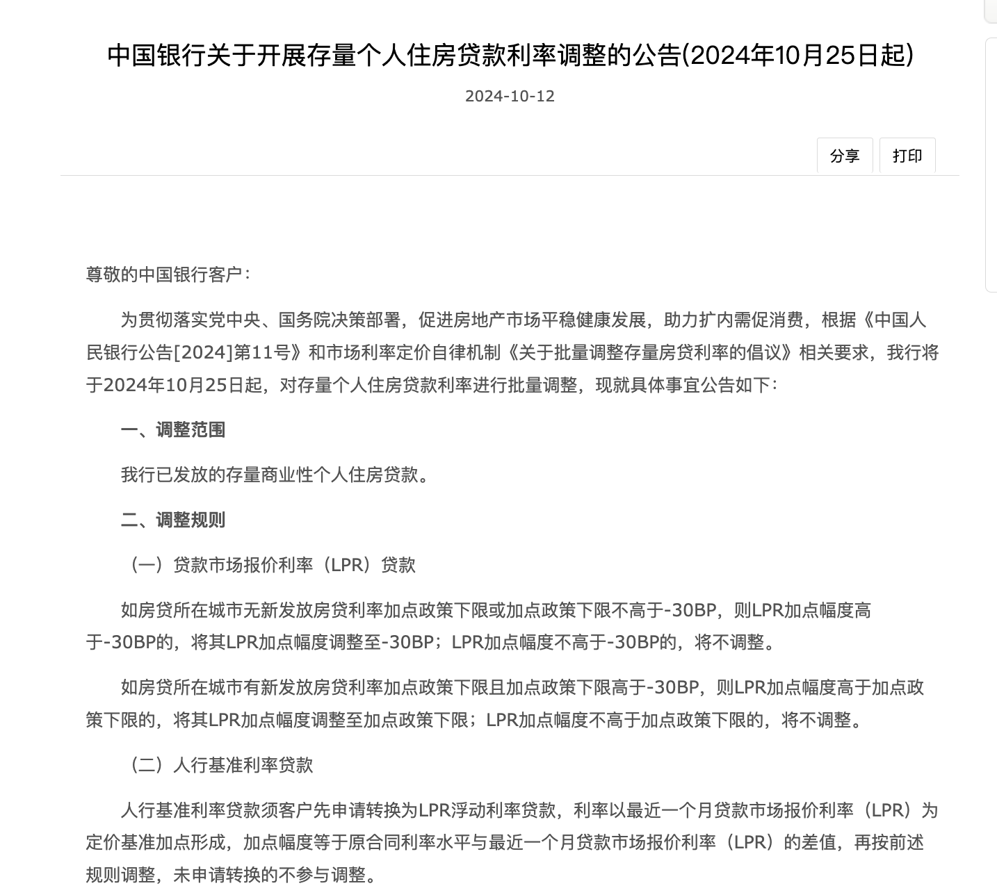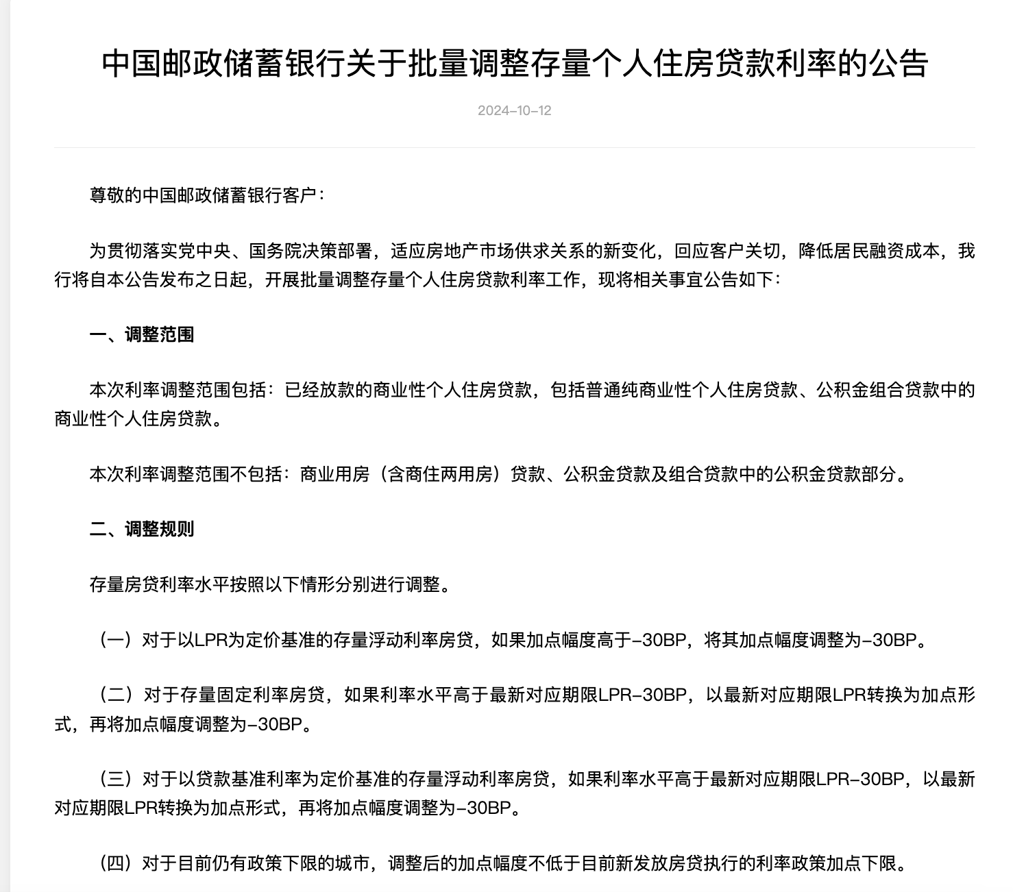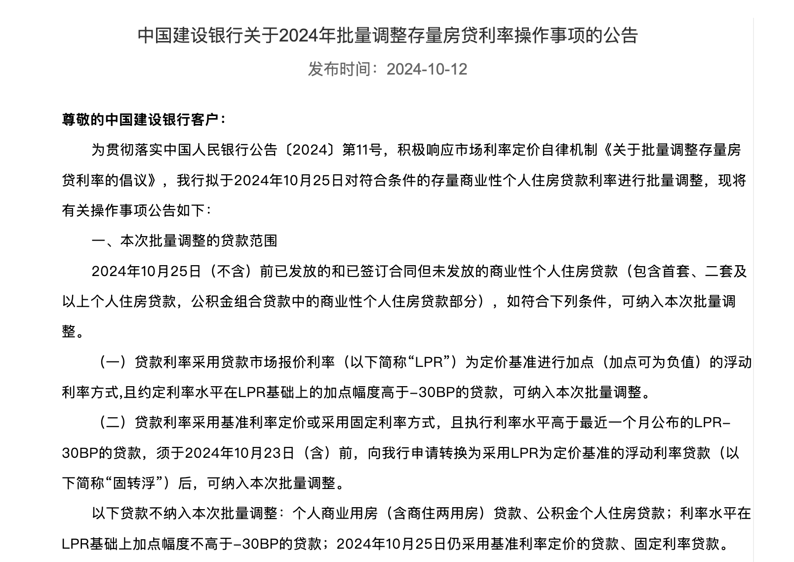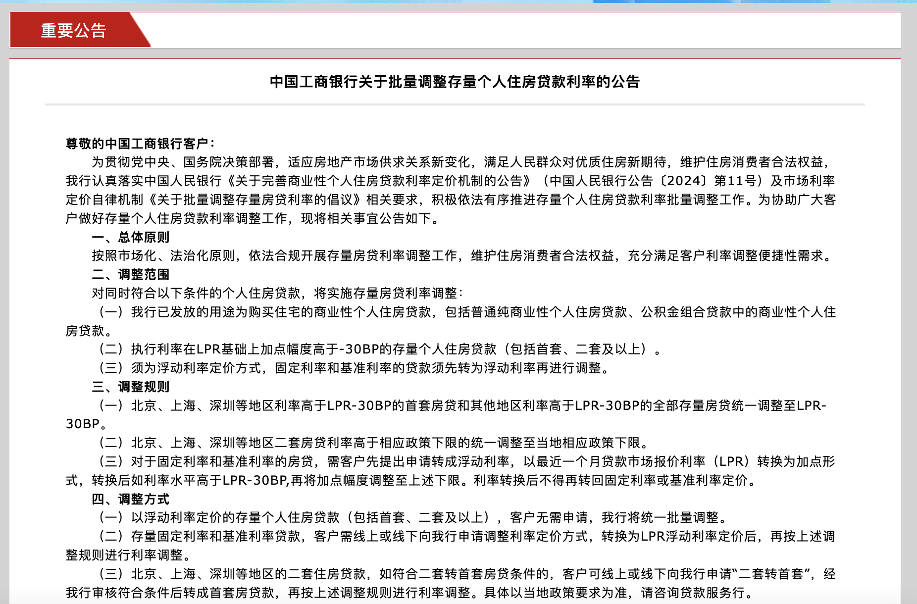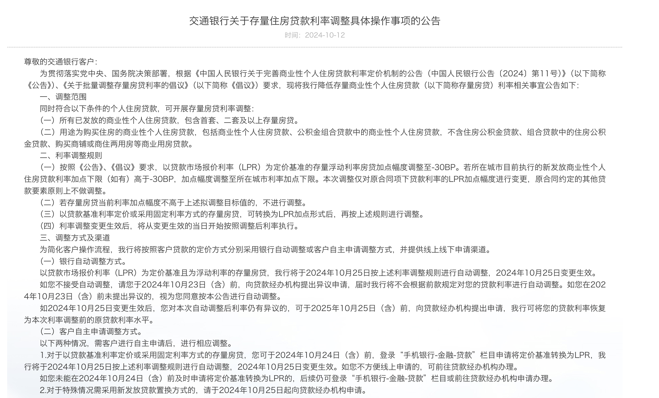 銀行自動調(diào)整方式,即,對于符合條件的存量個人住房貸款,上述銀行將于2024年10月25日集中批量調(diào)整合同貸款利率。