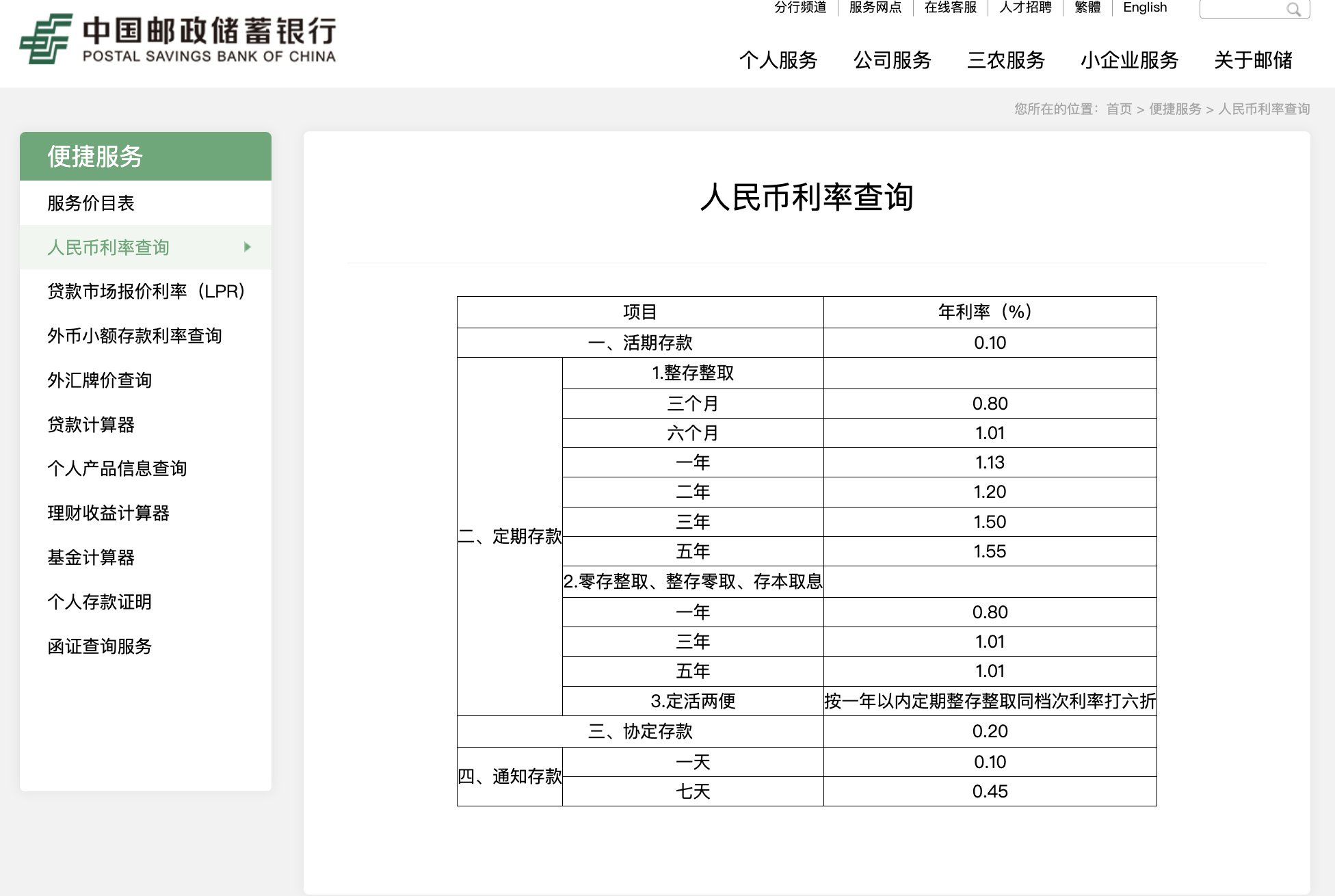 事實上,今年7月25日,國有大型商業銀行已對人民幣存款利率進行過一次調整,彼時工商銀行、農業銀行、中國銀行、建設銀行、交通銀行調整后3個月、6個月、1年期、2年期、3年期、5年期定期存款利率(整存整取)分別為1.05%、1.25%、1.35%、1.45%、1.75%、1.8%。郵儲銀行調整后3個月、6個月、1年期、2年期、3年期、5年期定期存款利率(整存整取)為1.05%、1.26%、1.38%、1.45%、1.75%、1.8%。