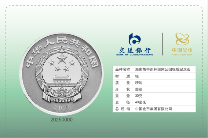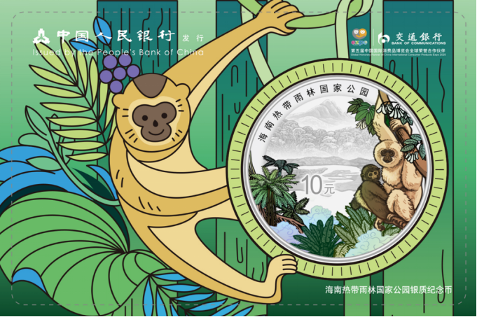 此次發布的聯名新品是中國人民銀行于2025年4月15日發行的海南熱帶雨林國家公園金銀紀念幣套裝中的一部分。紀念幣以海南長臂猿、坡壘、桫欏等珍稀動植物為設計元素,輔以五指山、萬泉河等自然景觀,通過綠色漸變色調的巧妙運用,生動展現了海南熱帶雨林的生態之美,體現了人與自然的和諧共生,彰顯了綠色金融理念與生態保護意識的深度融合。