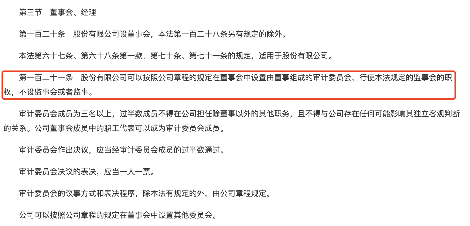 2024年7月1日起,新修訂的《中華人民共和國公司法》正式施行。其中,第一百二十一條明確提到“股份有限公司可以按照公司章程的規定在董事會中設置由董事組成的審計委員會,行使本法規定的監事會的職權,不設監事會或者監事。”