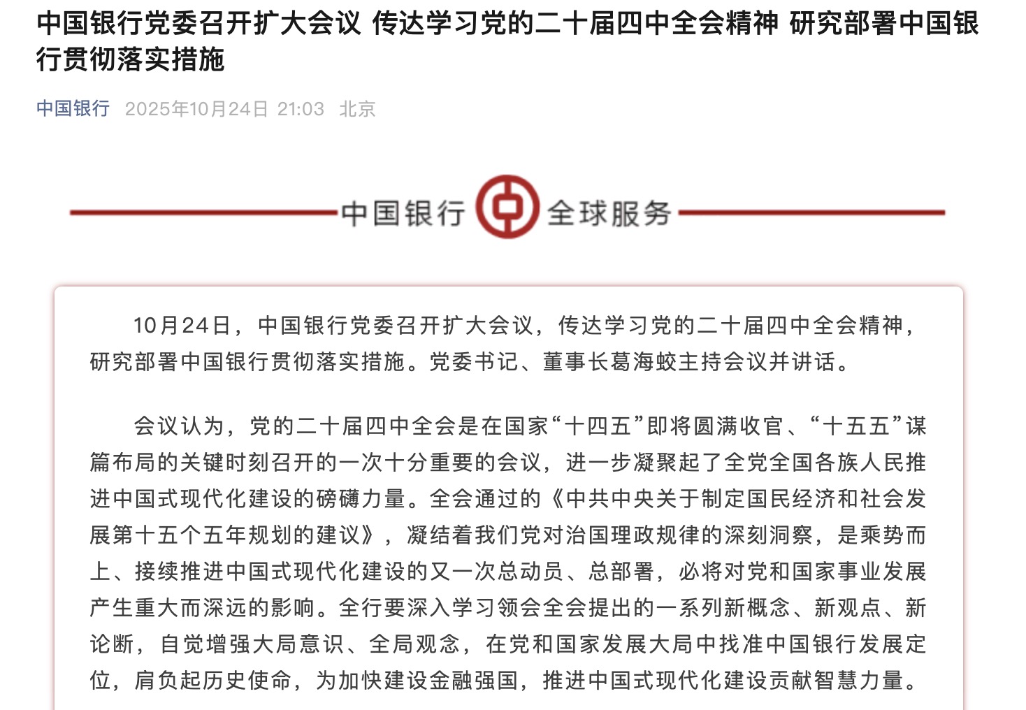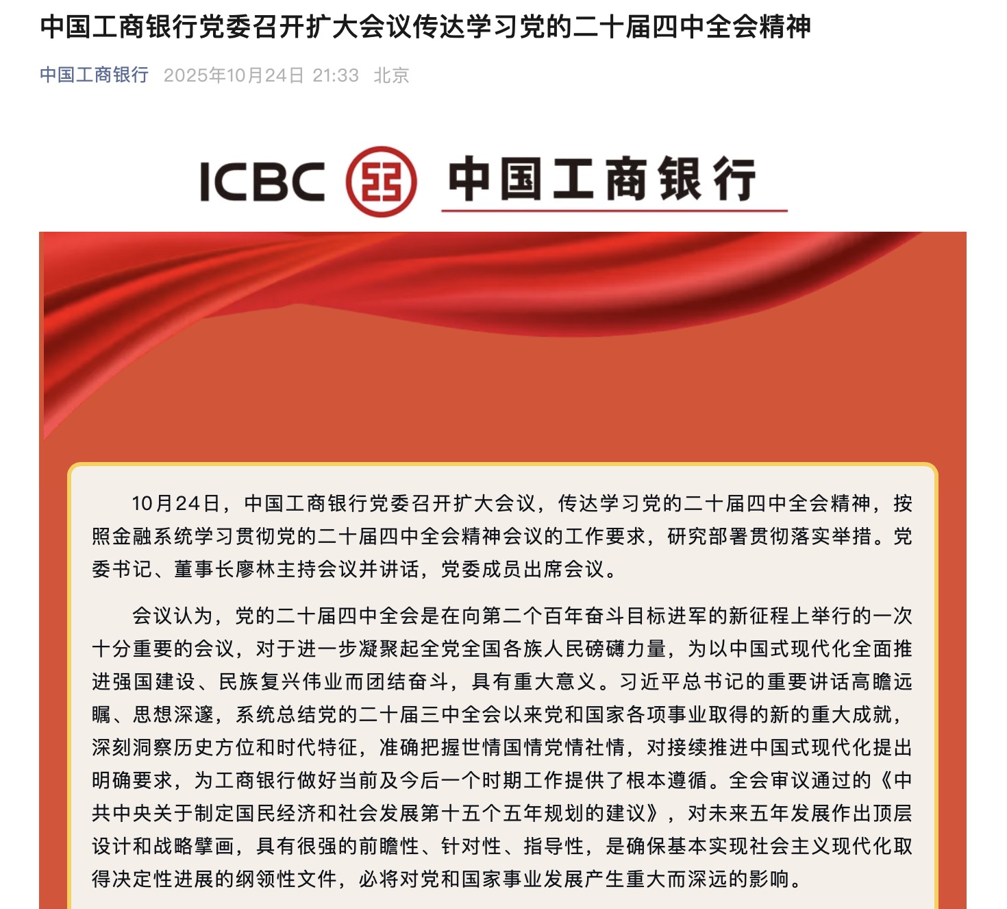 10月24日,工商銀行、農業(yè)銀行、中國銀行、建設銀行、交通銀行、郵儲銀行黨委紛紛召開會議傳達學習黨的二十屆四中全會精神,按照金融系統(tǒng)學習貫徹黨的二十屆四中全會精神會議的工作要求,研究部署貫徹落實舉措。