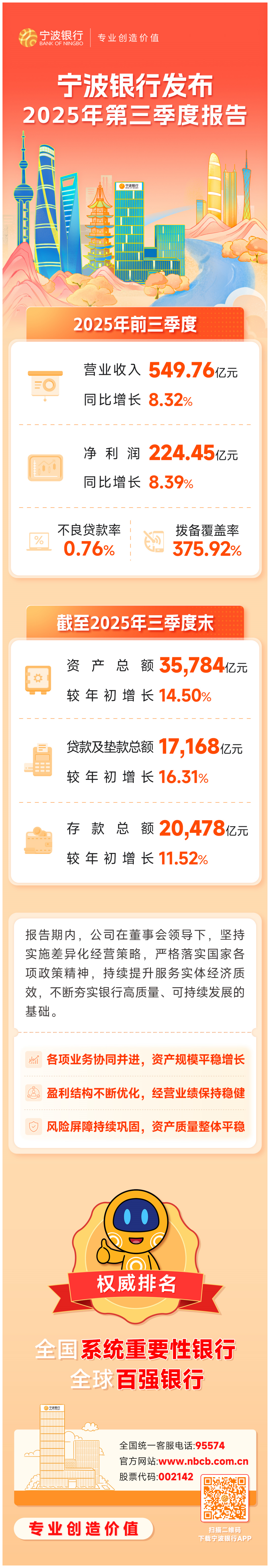 2025年三季度,面對復雜嚴峻的內外部經營環境,寧波銀行在董事會的領導下,堅持實施差異化經營策略,嚴格落實國家各項政策精神,持續提升服務實體經濟的質效,不斷夯實銀行高質量、可持續發展的基礎。
