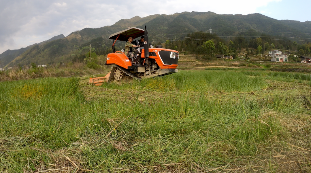 在環抱大山的田地里耕地的馬禹。馬上消費供圖