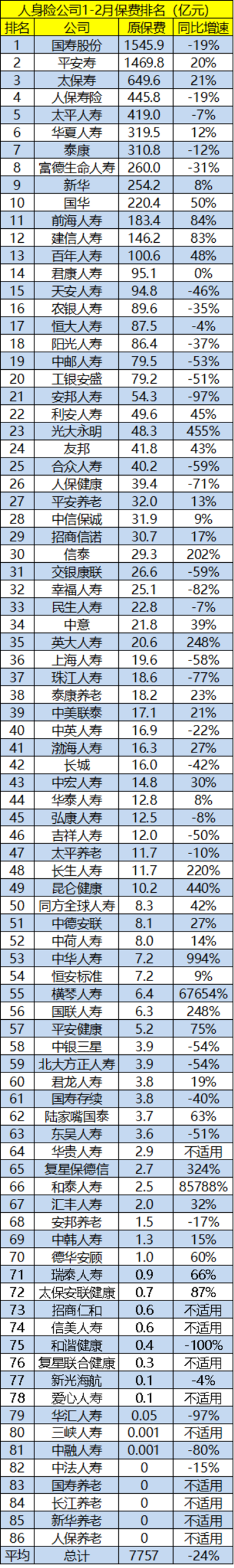 86家財(cái)險(xiǎn)公司1-2月保費(fèi)排名出爐 24家負(fù)增長(zhǎng)2018-04-04 19:55