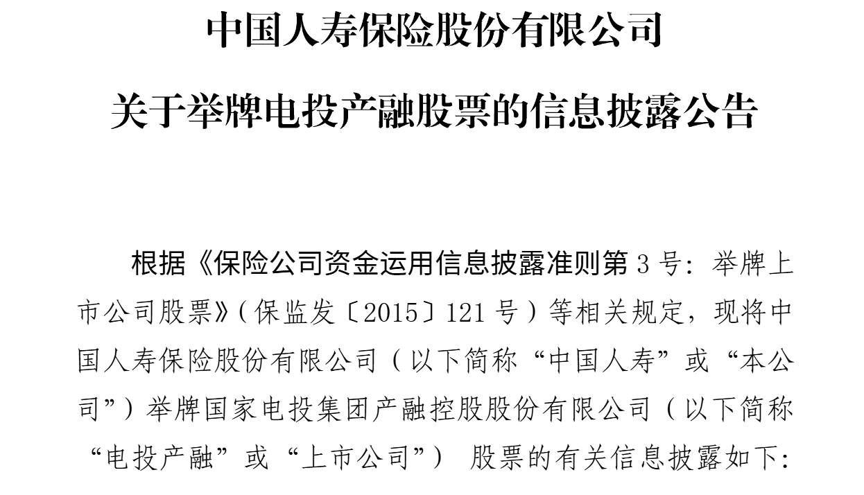 時隔兩年,中國人壽保險股份有限公司(以下簡稱“中國人壽”)再次舉牌上市公司。這一次的舉牌對象是國家電投集團產融控股股份有限公司(證券簡稱“電投產融”,證券代碼000958)。