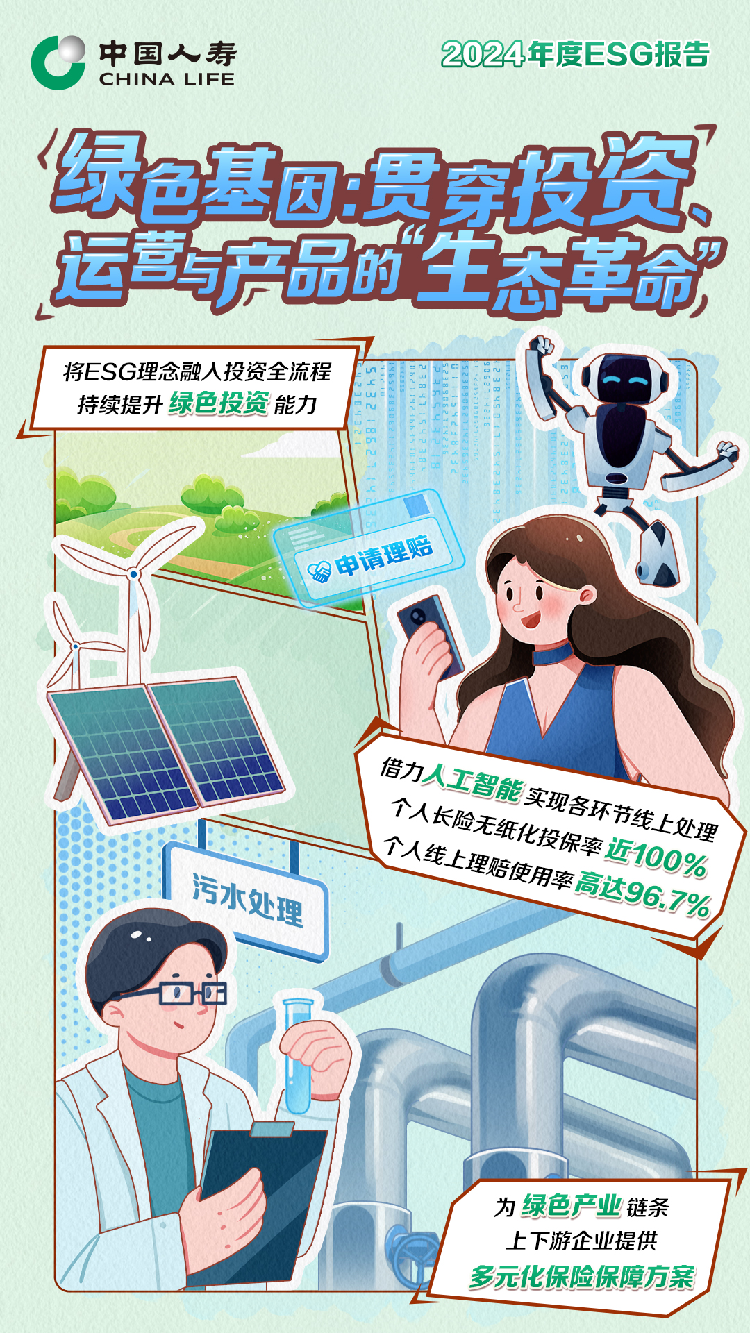 堅(jiān)守綠色發(fā)展理念,中國人壽壽險(xiǎn)公司從產(chǎn)品服務(wù)、投資布局到日常運(yùn)營全面踐行效率、和諧、持續(xù)的發(fā)展目標(biāo)。以綠色保險(xiǎn)助推國家經(jīng)濟(jì)社會的全面綠色轉(zhuǎn)型,持續(xù)為綠色產(chǎn)業(yè)鏈條上下游企業(yè)提供意外、醫(yī)療、壽險(xiǎn)等多元化保險(xiǎn)保障;將ESG理念融入投資全流程,在綠色交通投資、綠色轉(zhuǎn)型投資、綠色鄉(xiāng)村產(chǎn)業(yè)投資和“一帶一路”綠色低碳建設(shè)方面投資多個(gè)項(xiàng)目,持續(xù)釋放綠色金融效能;將低碳理念貫穿于經(jīng)營管理全流程,借力人工智能,實(shí)現(xiàn)各環(huán)節(jié)線上處理,個(gè)人長險(xiǎn)無紙化投保率近100%,個(gè)人線上理賠使用率高達(dá)96.7%,便利客戶服務(wù),實(shí)現(xiàn)綠色低碳運(yùn)營。聚焦“雙碳”目標(biāo),堅(jiān)持守正創(chuàng)新,啟動氣候風(fēng)險(xiǎn)情景分析,搭建壓力測試分析框架,制定應(yīng)對策略,增強(qiáng)公司氣候韌性。