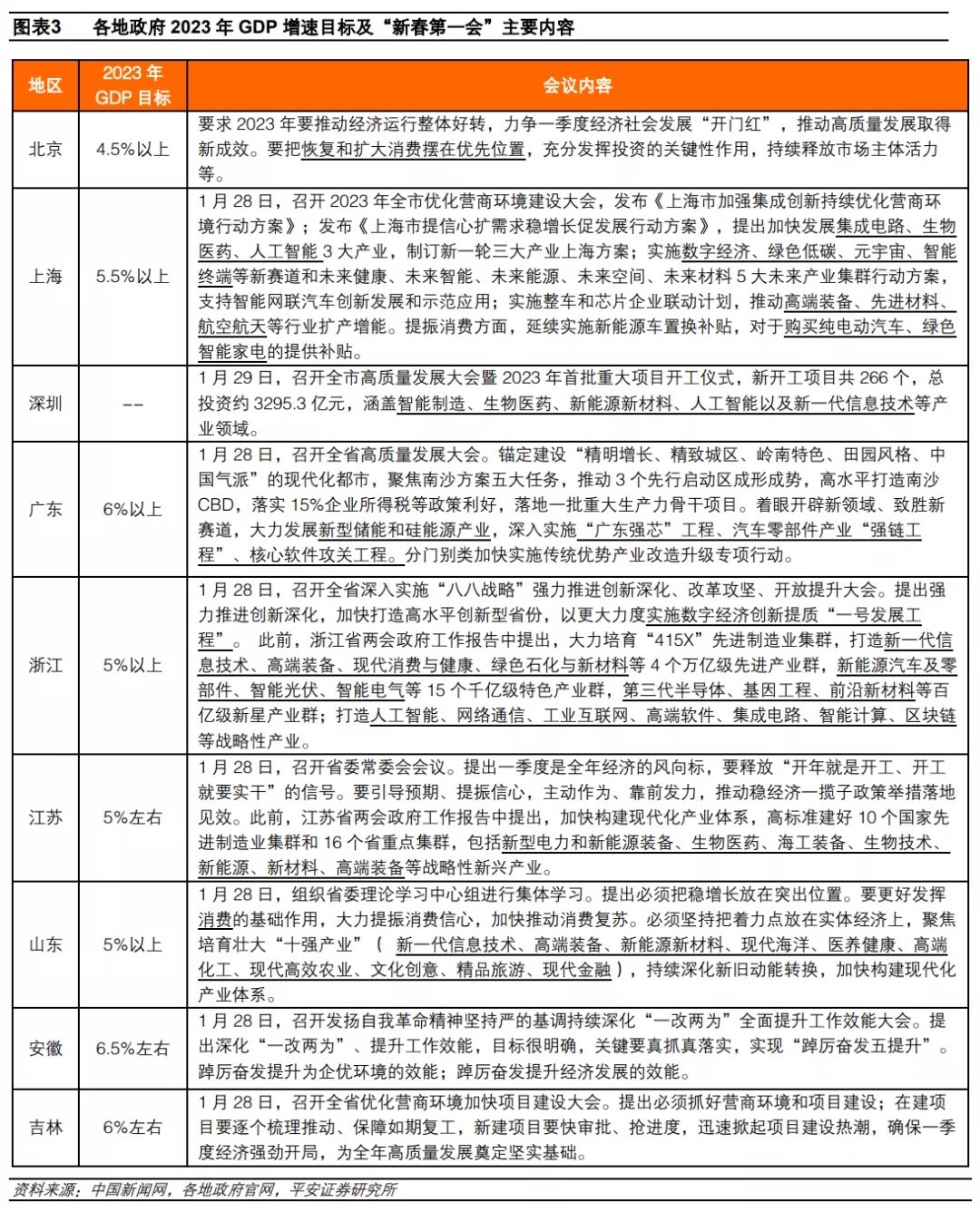 此外,平安證券關注到春節之后各地政府發展經濟搶跑的跡象,廣東、浙江、安徽、吉林、上海等地都召開了省級層面的“新春第一會”及新一輪優化營商環境行動方案,從部署內容來看,高質量發展、優化營商環境、重點項目建設等主題是關注的重點。當結合推動高質量發展、發展現代產業體系、統籌發展和安全、全面深化改革開放、大力提振市場信心、把實施擴大內需戰略同深化供給側結構性改革有機結合起來等關鍵詞看,新一輪政府發力經濟建設,不僅符合中國中長期的發展規劃,也符合疫情之后企業和個人對于美好生活的向往。而行業層面則看到了諸多政策的優化和調整,比如房地產、互聯網、教育、醫療、游戲等。中國資本市場在此過程中將推動凝聚中長期預期,2022年提風物長宜放眼量,2023年則是長風破浪會有時,中國經濟的韌性、中國企業的調整能力都會逐步地體現出來。