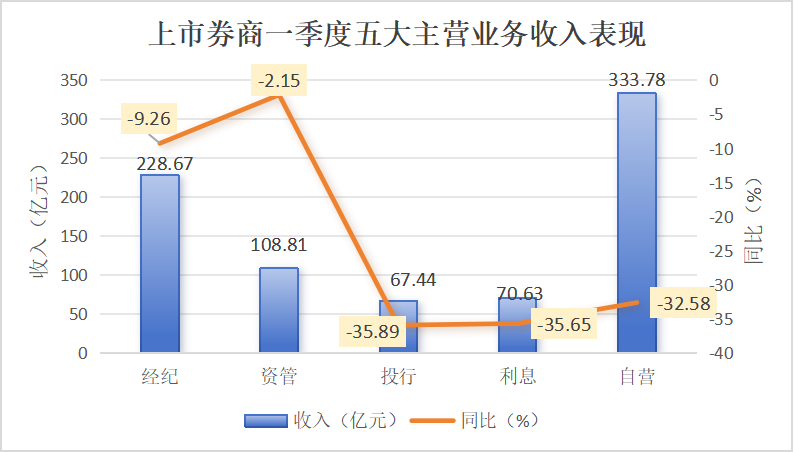 從券商五大主營業務來看,一季度各項業務收入均有所下滑,其中,受益于轉型成效初顯,資管業務收入同比降幅最小。申萬宏源非銀金融行業首席分析師羅鉆輝表示:“費率改革背景下,券商的公募子公司有望展現利潤韌性。”