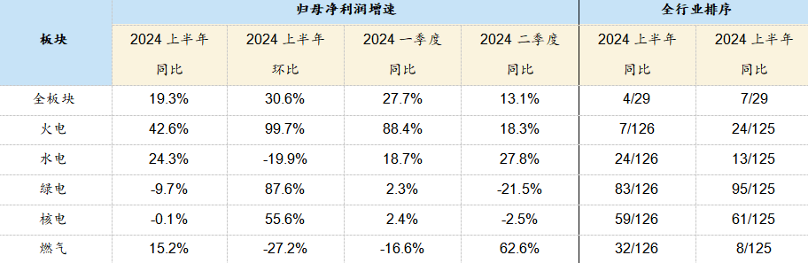 公用事業(yè)板塊業(yè)績改善幅度全行業(yè)領(lǐng)先。橫向?qū)Ρ榷裕檬聵I(yè)板塊歸母凈利潤增速在24年上半年同比、24年上半年環(huán)比分別位于全行業(yè)第四(前15%)、第九位(前30%)。從細(xì)分子行業(yè)來看,選取三級行業(yè)與火電、水電、綠電、核電、燃?xì)膺M行對比,火電、水電業(yè)績同比改善幅度較大,分別位居7/126、24/126,除綠電外其余板塊24年上半年業(yè)績同比改善幅度均位于全行業(yè)的前50%。