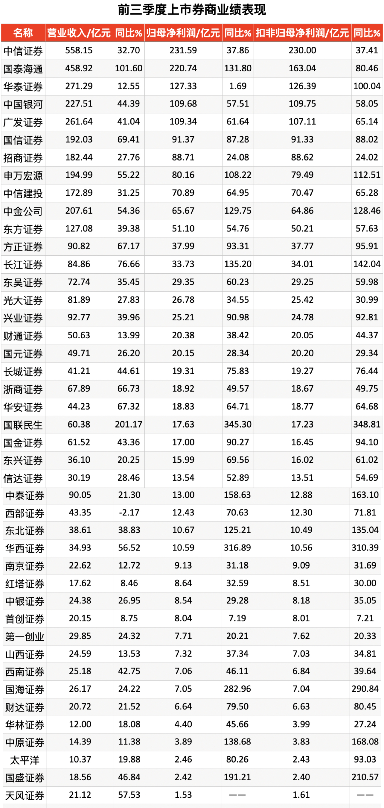 從整體情況來看,前三季度上市券商的業績表現大大超出市場預期,營業收入和歸母凈利潤均呈現出兩位數的高速增長態勢。具體而言,頭部券商憑借自身優勢穩定發揮,多家通過并購重組實現資源優化配置、業務協同發展的券商,以及部分業績彈性十足的中小券商,都成為推動整個行業向前發展的突出亮點。