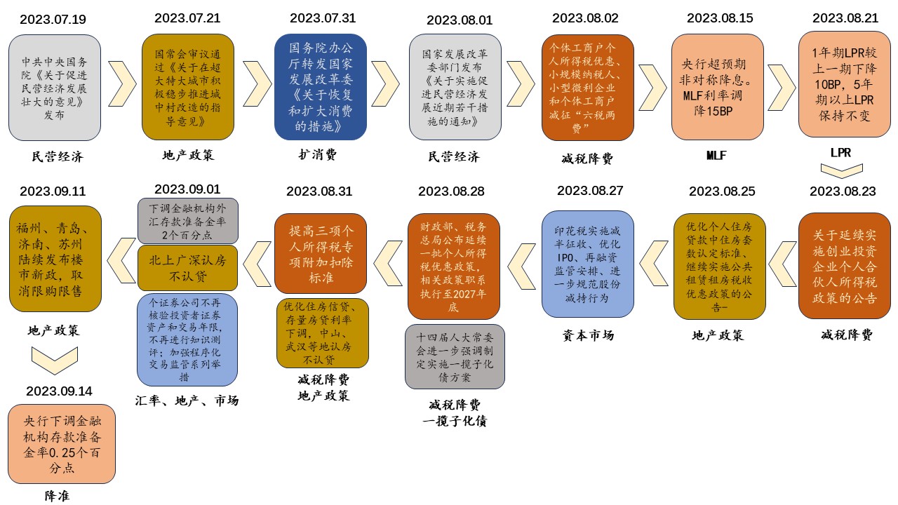 旨在穩定經濟的國內政策8月份開始逐步實施,主要集中在房地產領域和資本市場的激活。具體來看,房地產政策改善包括一線核心城市認房不認貸、下調最低首付款比例、降低住房貸款利率下限,包括對存量首套房貸款。為了活躍資本市場,收緊IPO、加強對股東拋售的限制、降低融資利潤率、規范量化和降低印花稅等措施已經實施。這些措施有效地穩定了經濟,顯著降低了經濟快速下滑和失控的風險。考慮到此前市場預期迅速下降,信心較低,政策有希望將預期進行扭轉。