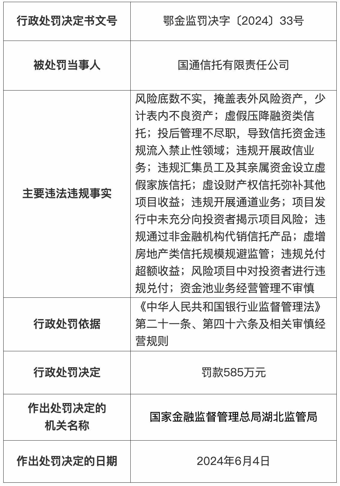 本報訊 (記者張安)6月14日,國家金融監(jiān)督管理總局湖北監(jiān)管局發(fā)布22張罰單,國通信托因13項違法違規(guī)事實被處罰款585萬元。同時,21名相關(guān)責(zé)任人被處罰,其中18名責(zé)任人被處警告,時任國通信托副總裁曹陽等3名責(zé)任人被處警告并罰款合計46萬元。