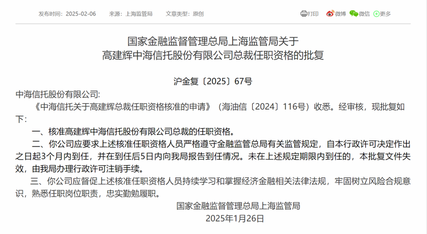 2月6日,國(guó)家金融監(jiān)督管理總局上海監(jiān)管局公布相關(guān)批復(fù),核準(zhǔn)高建輝中海信托股份有限公司(以下簡(jiǎn)稱“中海信托”)總裁的任職資格。