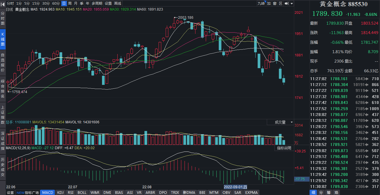 受到國際金價大幅下挫影響,近期A股黃金概念板塊指數也顯現弱勢。自9月份以來,截至9月26日,黃金概念指數期間已經累計下跌4.92%,期間上證指數累計下跌4.71%。9月27日,截至11:30,黃金概念指數則下跌0.66%。