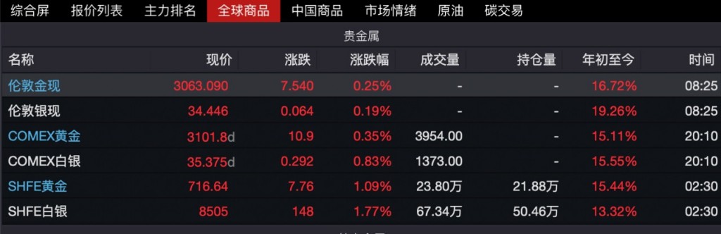 具體來看,北京時間3月27日22:50倫敦金現刷新歷史高位至3059.63美元/盎司。COMEX黃金期貨漲1.53%,報3068.60美元/盎司,COMEX黃金23:36也曾漲至3071.30美元/盎司創歷史新高;COMEX黃金6月合約漲1.51%,報3098.50美元/盎司,23:36曾刷新盤中歷史高位至3102.20美元/盎司。SHFE黃金盤中最高升至717.70元/克。