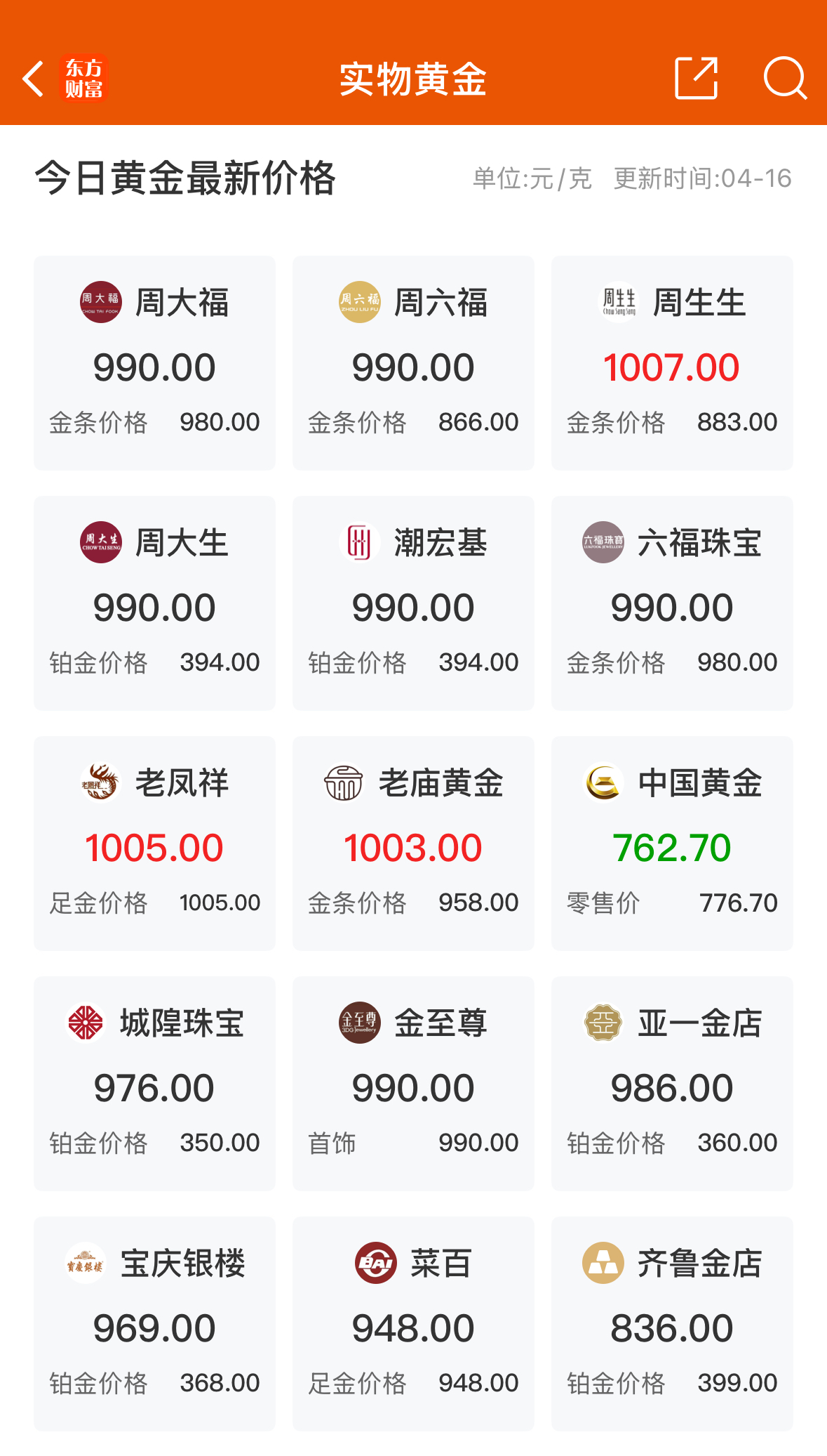 金飾方面,面對金價上漲不同品牌調價表現不一,如周生生黃金價格已調至1007元/克;而菜百、周大福等黃金價格則保持不變,4月15日菜百報價948元/克,周大福報價990元/克。