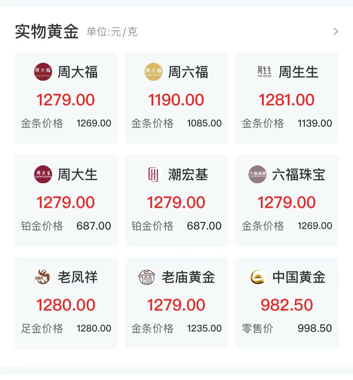 國內金飾方面,東方財富數據顯示,周生生足金價格已上調至1281元/克,老廟黃金、周大福、潮宏基、六福珠寶等足金價格上調至1279元/克。此外,周大福、六福珠寶金條報價達1269元/克,與金飾足金報價僅差10元,老廟黃金金條價格也達1235元/克,而周生生等品牌金條報價也在1100元/克左右。