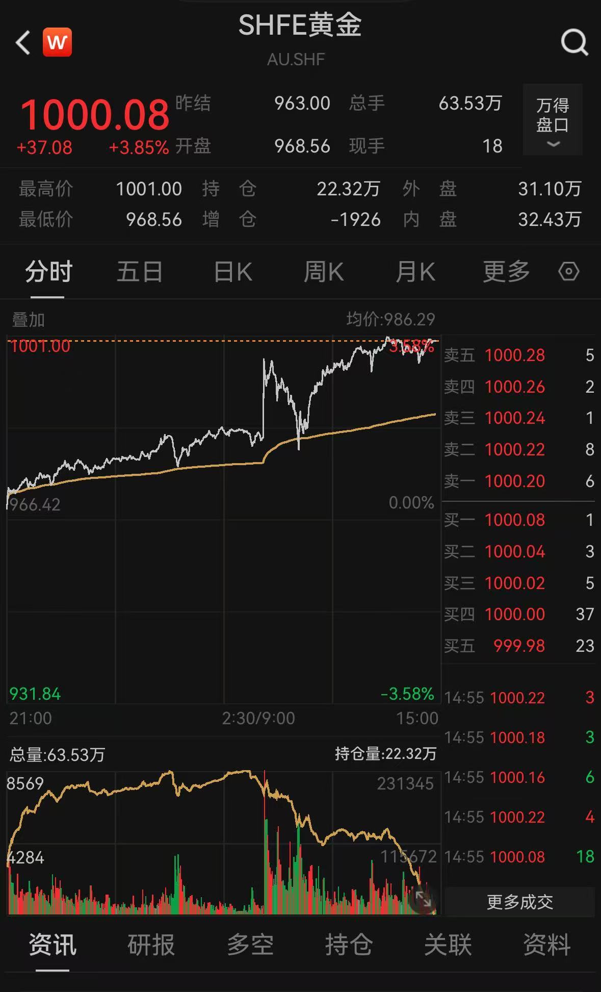 北京時間10月17日午后,SHFE黃金漲幅擴大,盤中價格一度突破1000元/克整數關口,年內漲幅逼近60%,與國際金價漲幅差距縮窄。