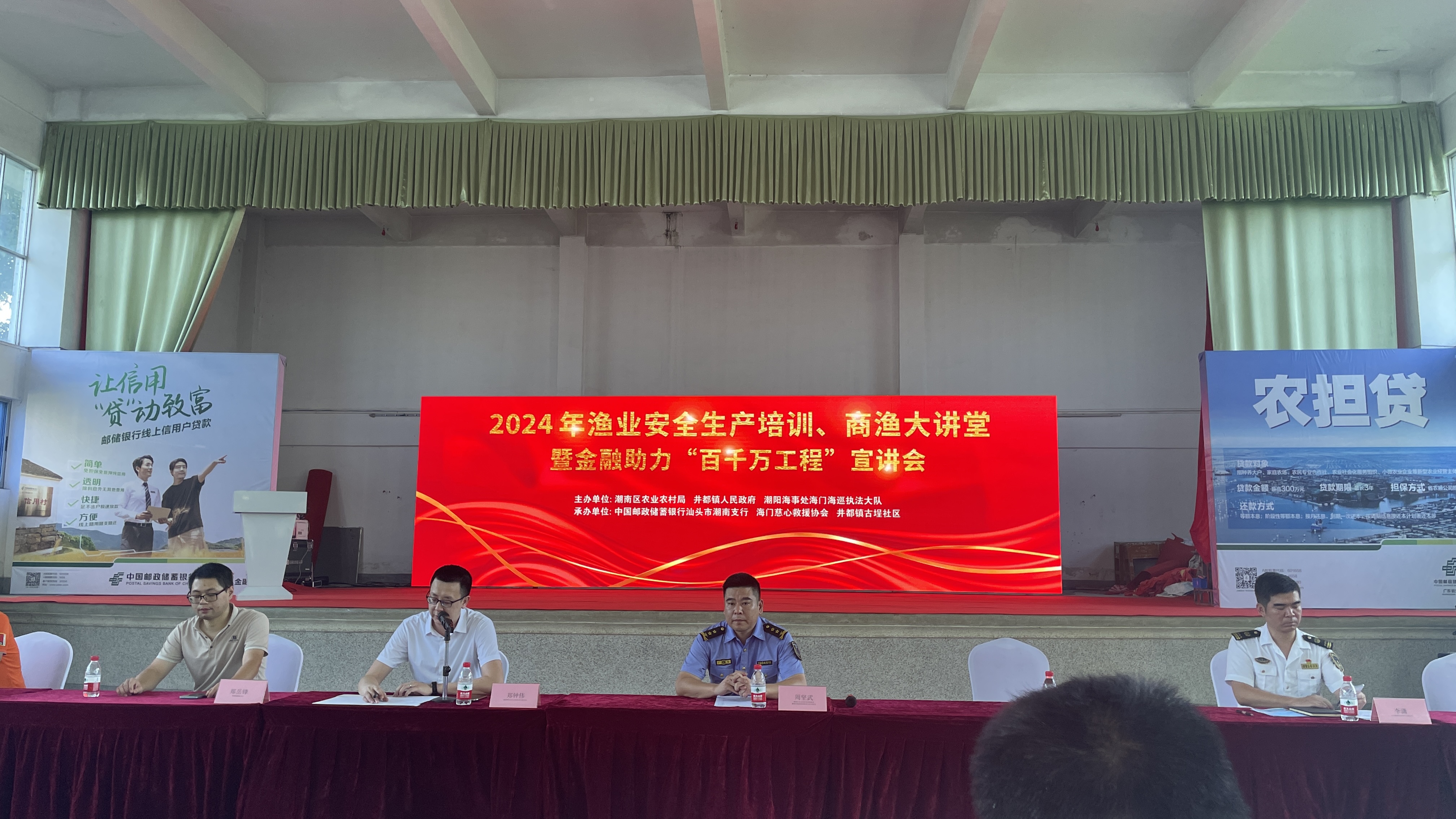 日前,郵儲銀行汕頭市潮南支行聯(lián)合汕頭市潮南區(qū)井都鎮(zhèn)人民政府、汕頭市潮南區(qū)農業(yè)農村局舉辦2024年漁業(yè)安全生產培訓、商漁大講堂暨金融助力“百千萬工程”宣講會。