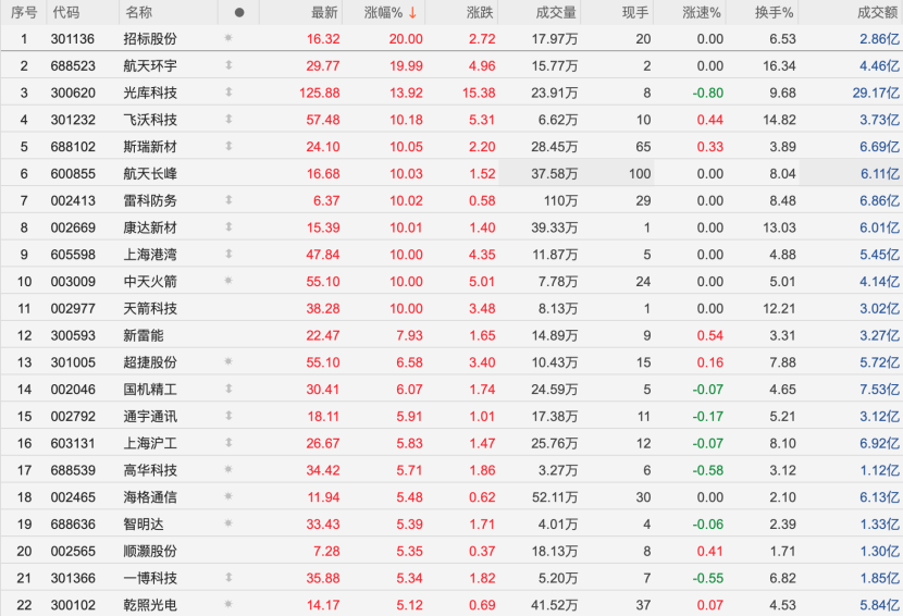 11月24日,商業航天概念板塊反復活躍,成為市場關注焦點。截至記者發稿,板塊內多只個股強勢漲停,包括招標股份(301136.SZ)、航天環宇(688523.SH)、航天長峰(600855.SH)、雷科防務(002413.SZ)、上海港灣(605598.SH)、中天火箭(003009.SZ)、天箭科技(002977.SZ)等。同時,光庫科技(300620.SZ)、飛沃科技(301232.SZ)、斯瑞新材(688102.SH)等個股也表現亮眼,漲幅位居板塊前列。