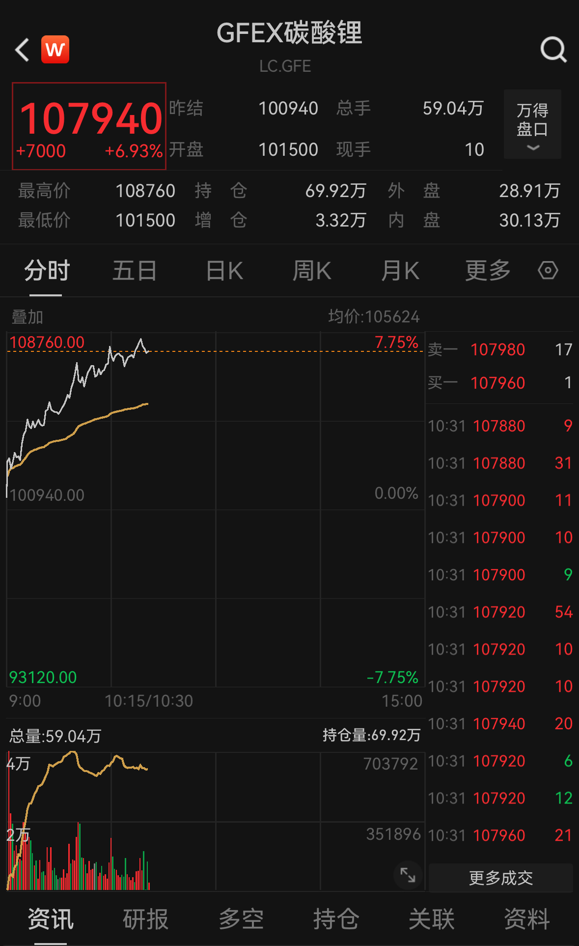 12月17日早間開盤,廣期所碳酸鋰主力合約漲幅一度沖高至7.75%,報10.88萬元/噸,價格創下自2024年5月份以來的新高,年內累計漲幅超40%。