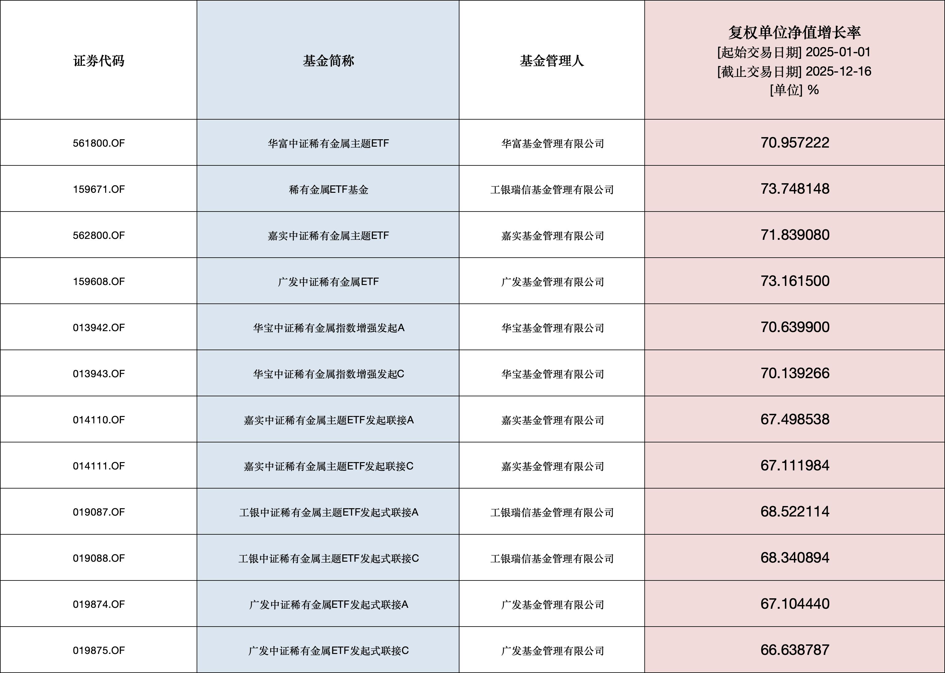 在稀有金屬ETF方面,Wind資訊數據顯示,截至12月16日,今年以來12只“稀有金屬ETF”凈值增長率平均達69.64%,表現十分亮眼。其中,華富中證稀有金屬主題ETF、稀有金屬ETF基金、嘉實中證稀有金屬主題ETF、廣發中證稀有金屬ETF、華寶中證稀有金屬指數增強發起A、華寶中證稀有金屬指數增強發起C等6只ETF年內凈值增長率均超70%。