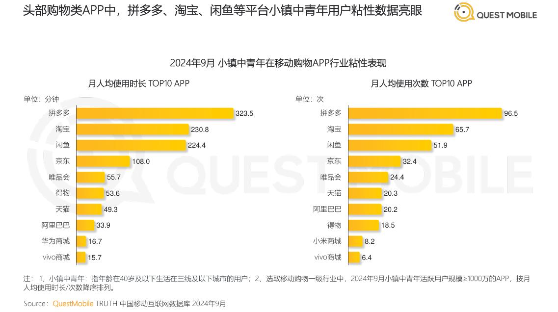 根據國家統計局數據,2024年,我國城鎮居民人均可支配收入同比增長4.7%,農村居民人均消費支出同比增長6.1%,城鄉居民收入差距持續縮小。縣域市場不僅釋放出更大消費活力,也表現出更強的消費意愿。Quest Mobile發布的《2024年小鎮中青年消費洞察報告》指出,小鎮中青年因為工作相對輕松、通勤時間短,有更多閑暇時間關注生活品質提升。近75%的被調查者愿意為高品質商品多付費,拼多多成為小鎮中青年月均使用時長和使用次數較多的頭部線上購物平臺。
