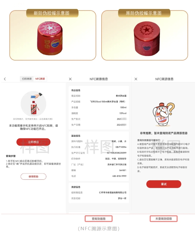 NFC溯源:2023年10月份,貴州茅臺酒啟用新膠帽,膠帽內嵌入RFID電子標簽,生產日期在2023年10月16日及以后且帶新膠帽的貴州茅臺酒,可通過“i茅臺App—我的—溯源”進入“NFC溯源”頁面后,用帶NFC功能的手機靠近膠帽即可獲取溯源信息。